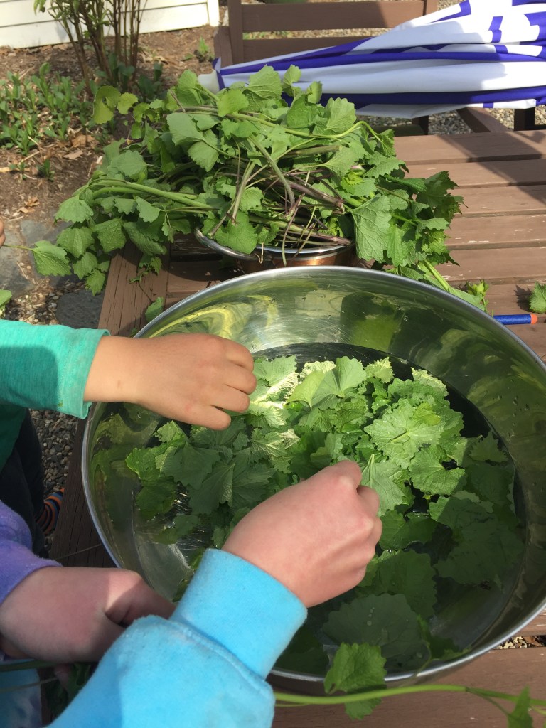 Garlic Mustard is new to me. It is an invasive species that is easy to find, and especially tasty in the spring. Ava took a “Wild Edibles” class at an Environmental Center near us last year and learned a lot about edible plants in our area. I have put my trust in her and with the arrival of the warm weather she took Leo on a nature walk in search of garlic mustard so that she could make us all some delicious pesto. It’s funny, when children feel empowered and given some autonomy to be trusted and do things on their own – they really shine. Ava and Leo were so excited to find the mother load of garlic mustard in the woods on our trail. They picked it, cleaned it and are now busy making it into a pesto to add to tonight’s dinner.