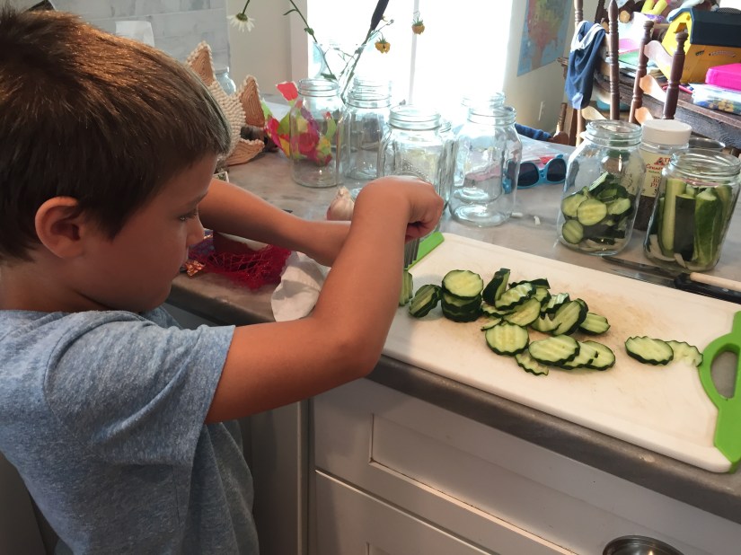 This pickling project was spearheaded by Leo. He loves pickles and was so excited by our surplus stock of cucumbers coming out of the garden that he requested we give pickle making a try. I’ve never made pickles before aside from what I call my lazy way of adding cucumbers to the pickle brine of empty pickle jars we bought from the store. It’s worked in the past, especially since we never really had a lot of cucumbers left over to jar. The ‘Homemade Refrigerator Pickle’ recipe we followed from A Spicy Perspectivehttps://www.aspicyperspective.com/best-homemade-refrigerator-pickles/ was easy, simple and the pickles taste great!