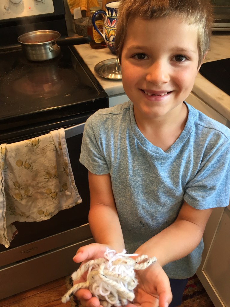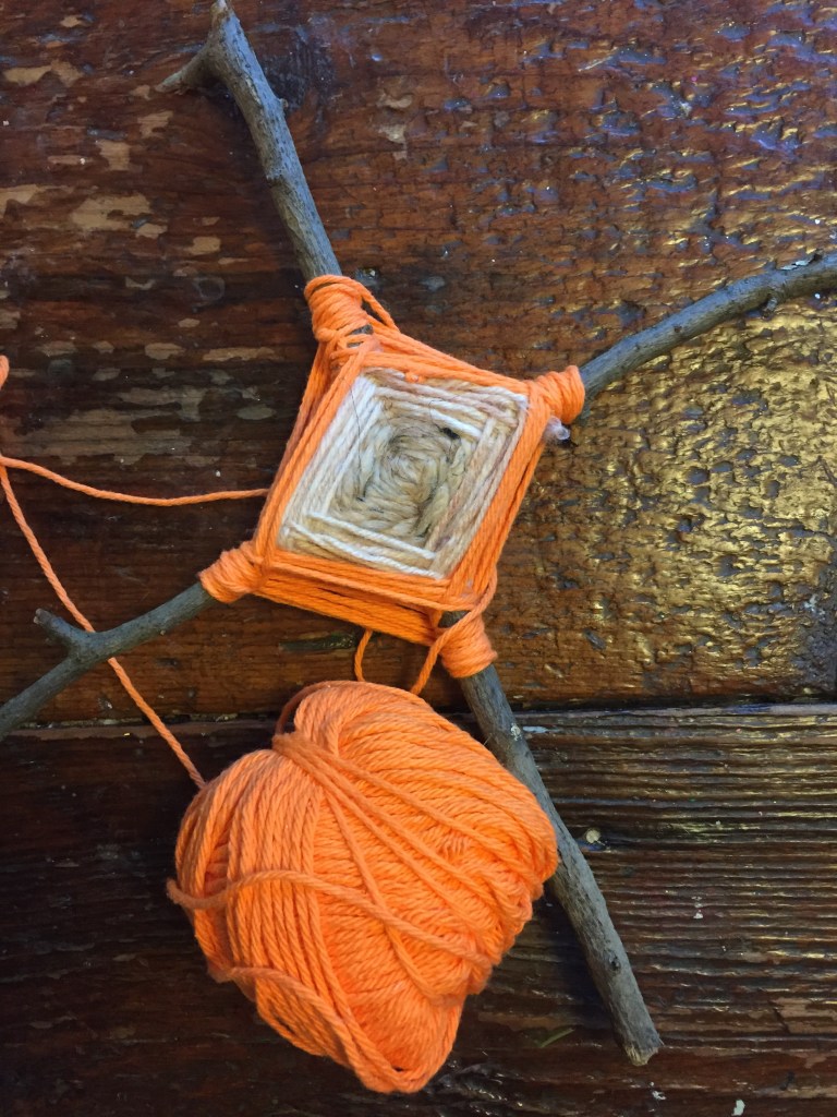 It’s a simple and fun project to try. We used the skin of two yellow onions, brought them to a boil in a pan of water on the stove top and simmered it until it reached a dark orange color. Then we added our acrylic yarn. If you are using actual wool, be sure to only add it once the water has cooled down, otherwise you can felt the wool with the hot water. We let our yarn sit until it reached our desired color. Kind of like dyeing Easter Eggs. Just check it periodically to determine how dark you’d like it. Then we put it outside to dry in the sun. Once dry, Leo used it to work on a ‘God’s Eye’ craft!