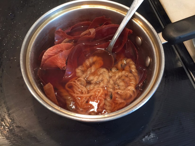 This was a new experiment in our house. Each year we go to a living history museum where they dye wool with ingredients from nature. It has always been amazing to see the beautiful colors that come from some surprising ingredients! One way that the early colonial settlers dyed wool was with onion skins. The yellow onions will give your wool a yellow -orange – beige – brown look and if you use Red onion skins, you will get a reddish purple coloring. Colors can also vary depending on the yarn color you are using. Leo and I decided to give dying yarn from onion skins a try!