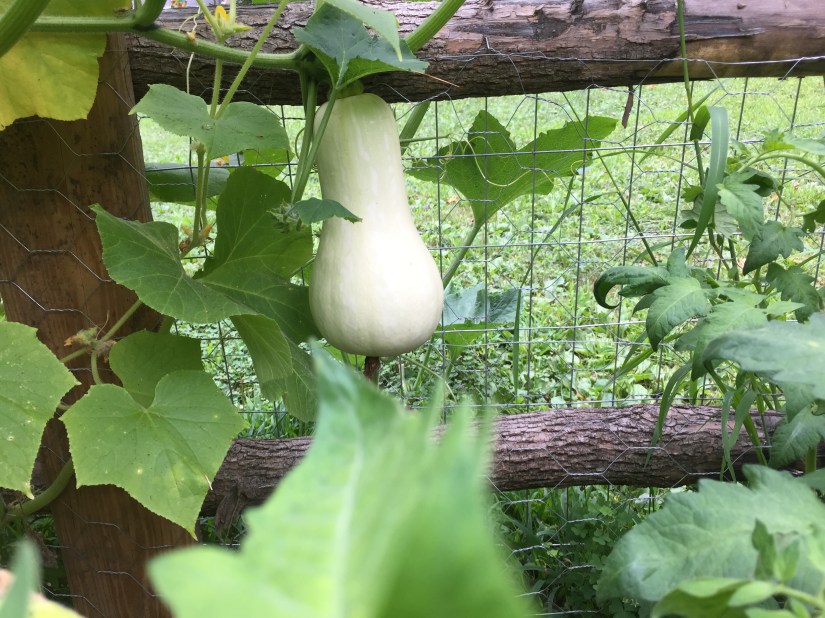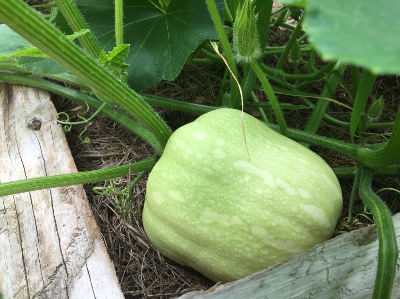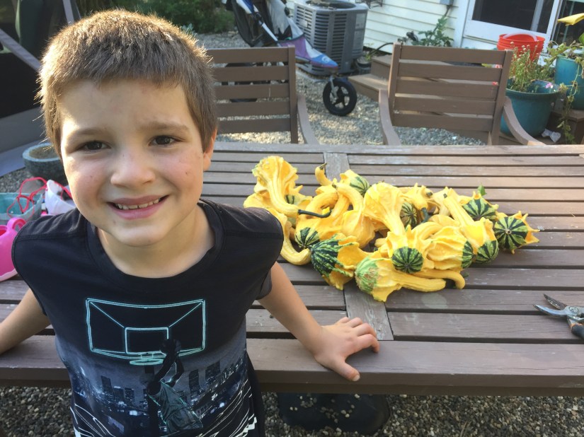 I Have been making sauce, canning, jarring, freezing, sun drying and roasting tomatoes daily. We’re eating many tomato sandwiches with fresh pesto and mayo. There is nothing quite like the amazing taste of a vine ripened tomato. It’s a simple thing that can bring so much joy. The tomatoes seem never ending and the garden is beginning to feel a bit like Big Anthony’s garden from the Strega Nonna storybook! For those not familiar, his garden is a bit out of control, but the unwieldy magic of a garden continues to be truly delightful and exciting! We keep finding new surprise plants that have sprung from our dirt and are now bearing fruit. We have butternut squash trellising across our fence, an unknown squash growing in the pumpkin patch and compost bin, cucumbers growing in our pot of Canna’s and a giant gourd plant taking over a flower bed!