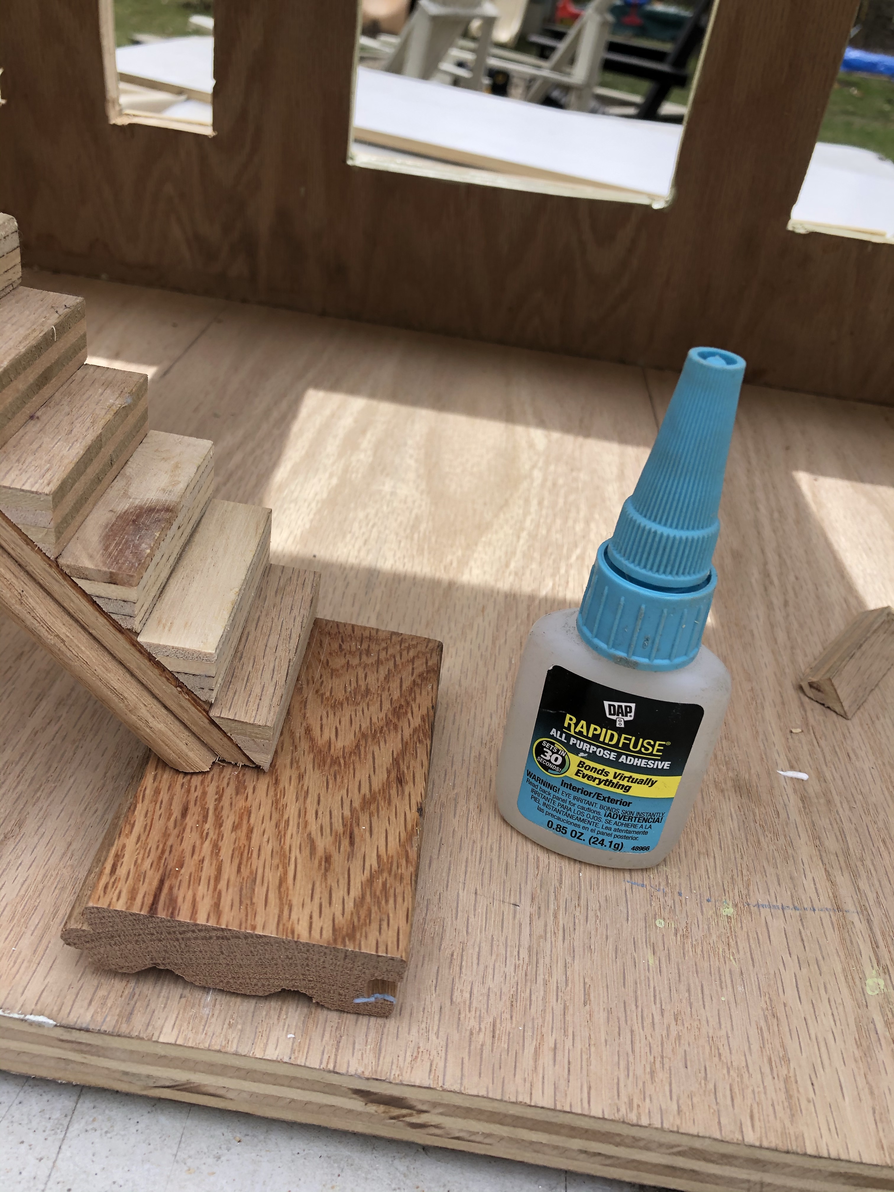 We used the off-cuts from the corner cuts to create the steps, glued to scrap hardwood flooring as the stair stringers, and landings. I routed out a groove for the second floor to slide into the slots. And Lily painted all the exterior a nice shade of pale green she picked from our leftover paint supply. Then I ripped some slices out of scrap, pre-rabetted cabinet plywood to create the small flower boxes. I was sure to be very cautious with the table saw. I also made Lily wear safety gear when ever she was around the tools. We wear ear protection, eye protection, gloves, and dust masks when cutting. Safety is very important.