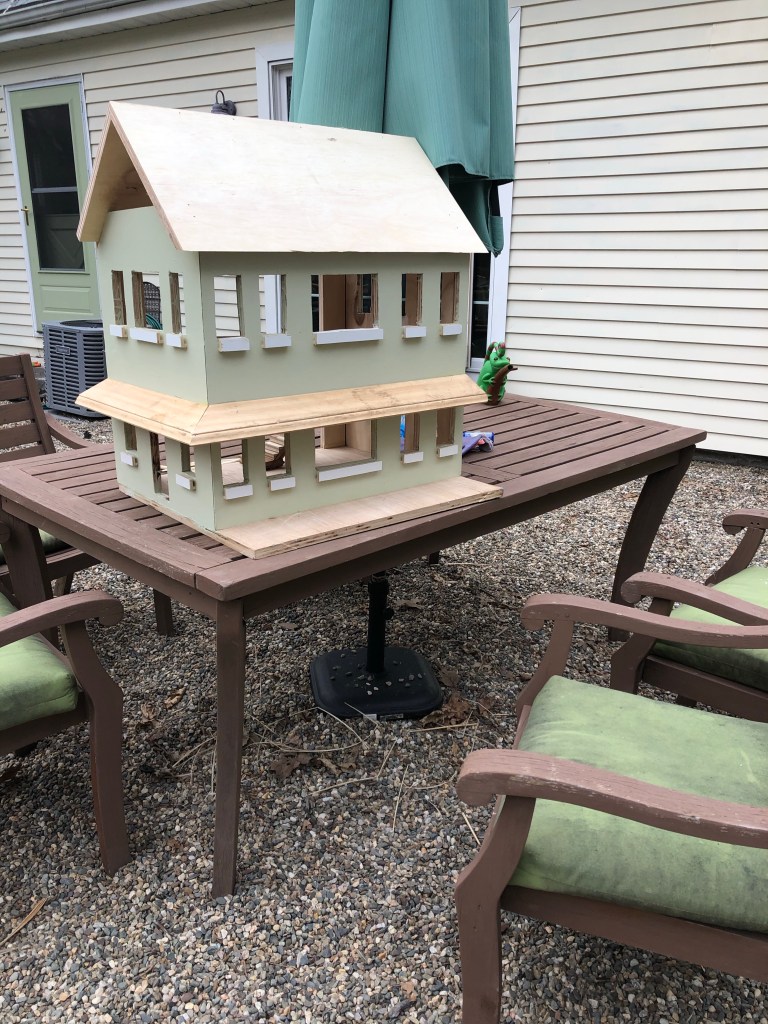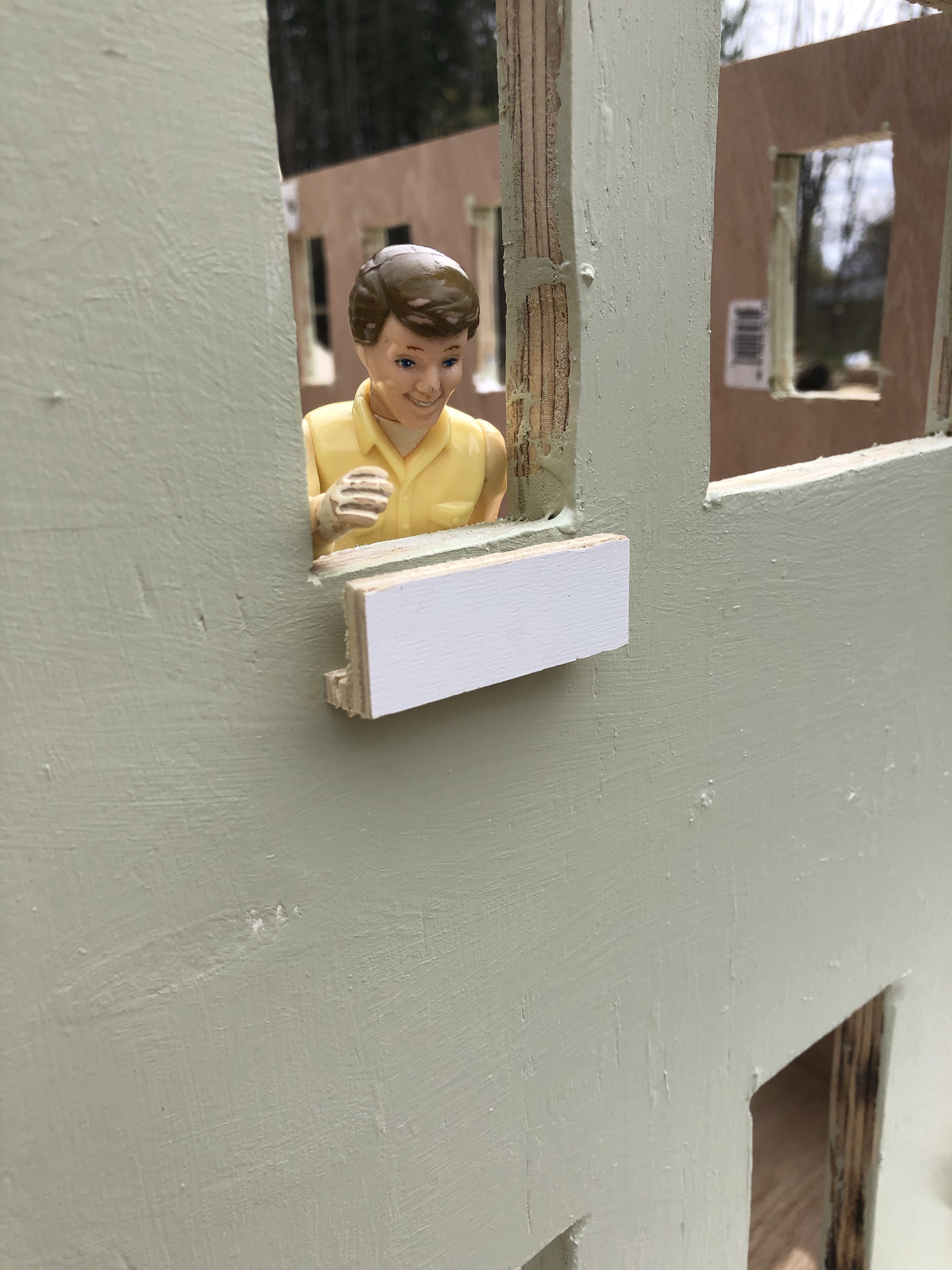 We started with a 2ft long layout ruler I have, and pencil marked all the locations, using the layout to quickly transfer lines and locations across sheets of ply and from one sheet to another, noting locations for windows, doors, porch roof, and interior second floor. I cut out the windows and doors with a jig saw, made 45 degree cuts in the 3/4 plywood at corners for clean intersection of walls, and secured the walls to a base with screws from below (counter sunk), w/ corner cabinet brackets on the interior to hold walls together. Lily got to painting the first coat of paint.