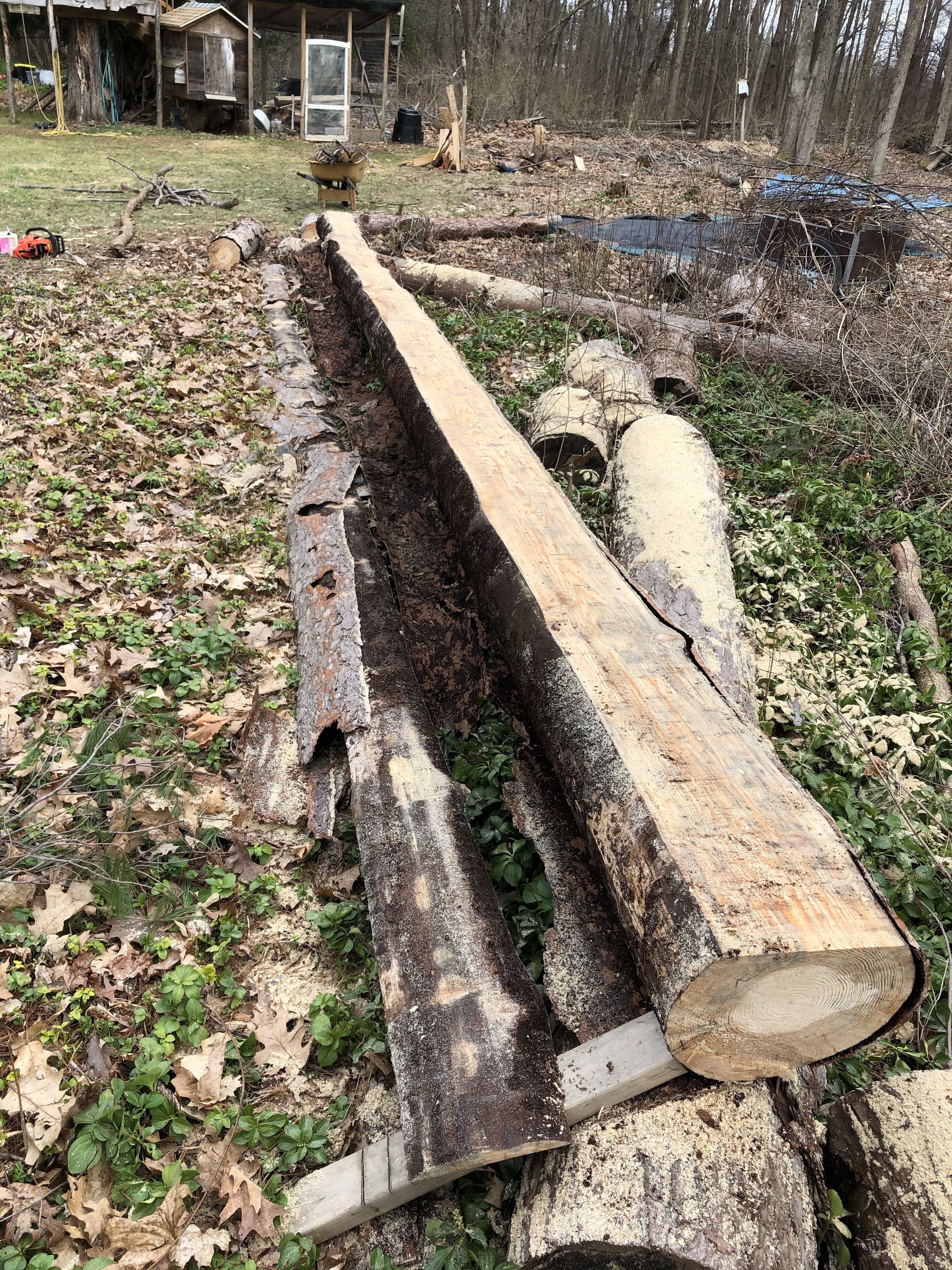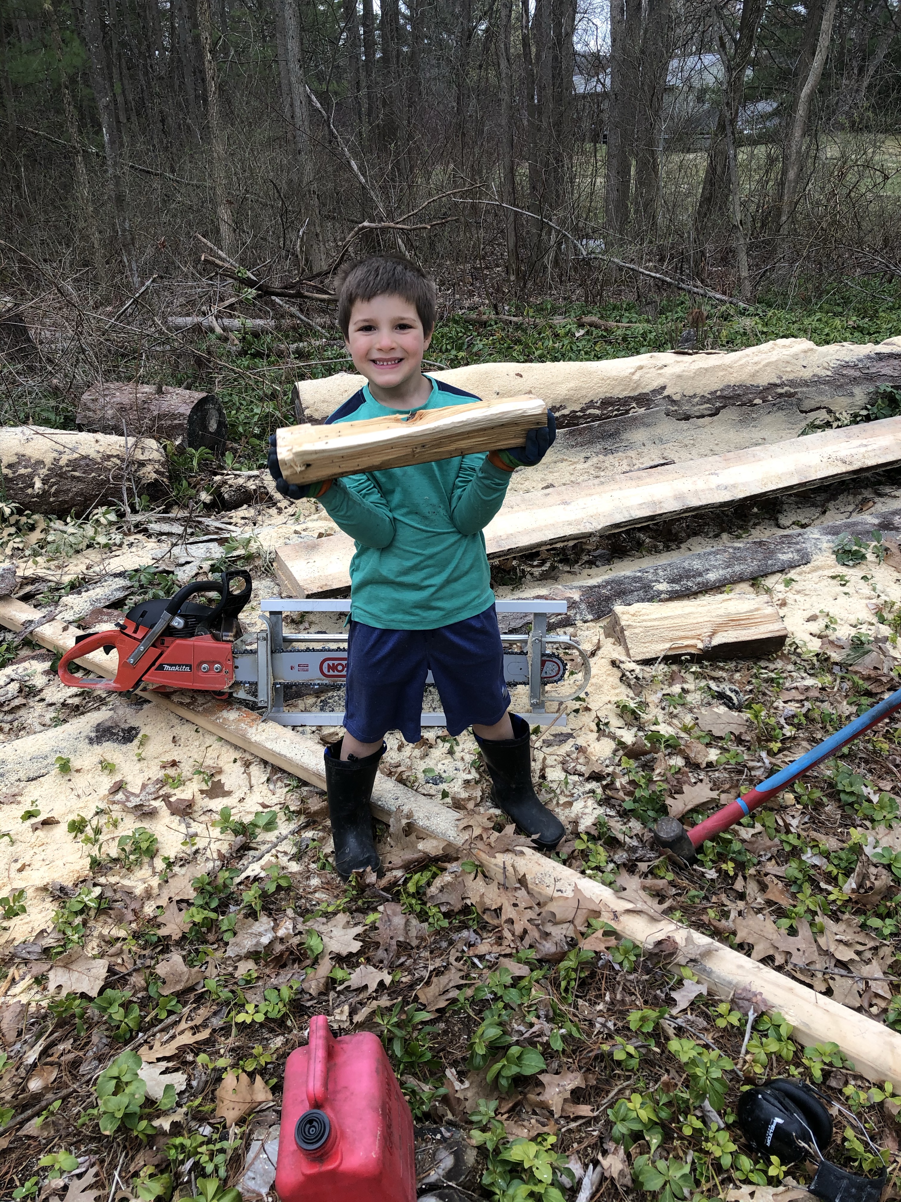 I had cut down some larger growth last year and started to clear the thicket of woods that had encroached over the years on our little 1950’s Cape. This year- with all the virus induced extra down time- I dedicated myself to clearing the remaining trees casting shade over the area we had in mind for our larger garden space. First I had to cut up the large pine that was sitting in the way. I set up my Alaskan Chain-saw Milling assembly for my large bar Makita chainsaw, and milled up some lumber we may use to build a shed and or Tree house soon. This was phase one of the clearing the land project.