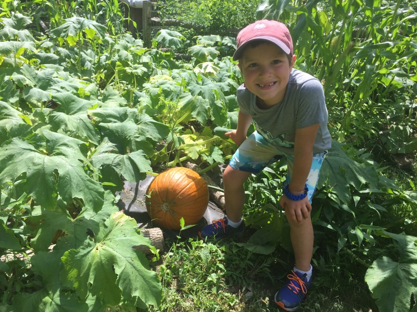 I Have been making sauce, canning, jarring, freezing, sun drying and roasting tomatoes daily. We’re eating many tomato sandwiches with fresh pesto and mayo. There is nothing quite like the amazing taste of a vine ripened tomato. It’s a simple thing that can bring so much joy. The tomatoes seem never ending and the garden is beginning to feel a bit like Big Anthony’s garden from the Strega Nonna storybook! For those not familiar, his garden is a bit out of control, but the unwieldy magic of a garden continues to be truly delightful and exciting! We keep finding new surprise plants that have sprung from our dirt and are now bearing fruit. We have butternut squash trellising across our fence, an unknown squash growing in the pumpkin patch and compost bin, cucumbers growing in our pot of Canna’s and a giant gourd plant taking over a flower bed!