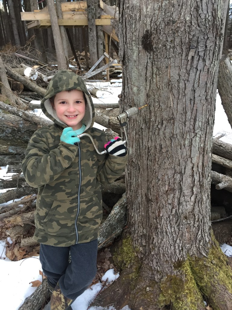 Maple syrup can be made from any species of maple tree. The highest concentration of sugar is found in the sap of the sugar maple. If you have some maple trees in your yard, it is a simple and very rewarding process to start tapping your trees. We picked up some sap buckets and taps from our local farmer supply store, but you could also use plastic food grade buckets. The best time to tap your trees is when the day temperatures stay consistently above freezing, but the nights still dip down below freezing. When we’ve collected enough sap we just put it in a pot on the stove until it boils down to syrup. It’s a great family tradition to share with your children. Who doesn’t love homemade pancakes and some homemade syrup!